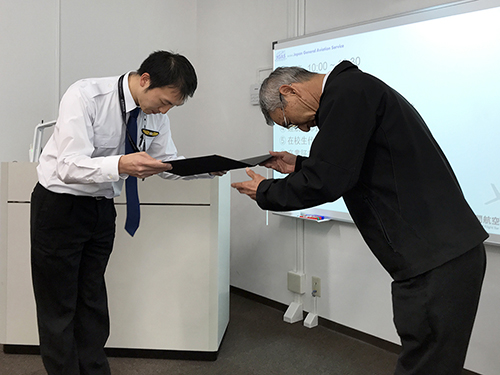 JGAS鹿児島フライトトレーニングセンター 運航本部長の山口です。今日は特別なお話をします。民間航空操縦士訓練学校の第一期生が卒業しました! ○○くん(仮名)、卒業おめでとう!